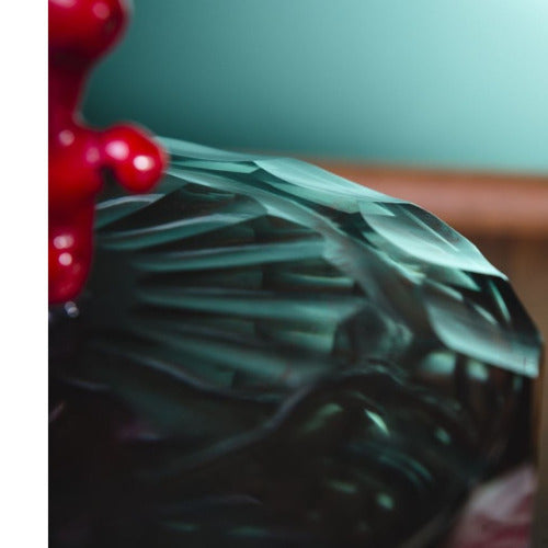 Cette boîte cubique joue sur les oppositions : un verre fumé aux nuances bleutées et facettées, qui capte et reflète la lumière, surmonté d’un bouchon en corail bambou d’un rouge intense.