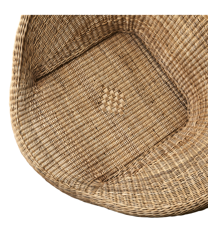 Cette chaise en rotin naturel et gommier bleu est entièrement tressée à la main par des artisans, dans la campagne africaine. Chaque pièce révèle un savoir-faire ancestral et une approche respectueuse de la matière, où les irrégularités, les variations de teinte et de tressage font partie intégrante de son charme. Non